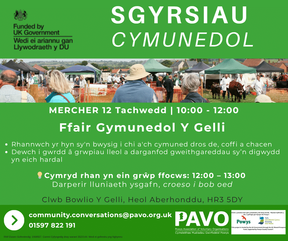 Fel rhan o raglen Cronfa Ffyniant a Rennir Llywodraeth y DU, rydym yn cynnal cyfres o Sgyrsiau Cymunedol ledled Powys. Rydym am glywed gan bobl leol a grwpiau cymunedol – i ddeall eich anghenion, eich blaenoriaethau a’ch dyheadau, ac i weithio gyda chi ar lunio atebion ar gyfer materion lleol sydd bwysicaf i’ch cymuned.