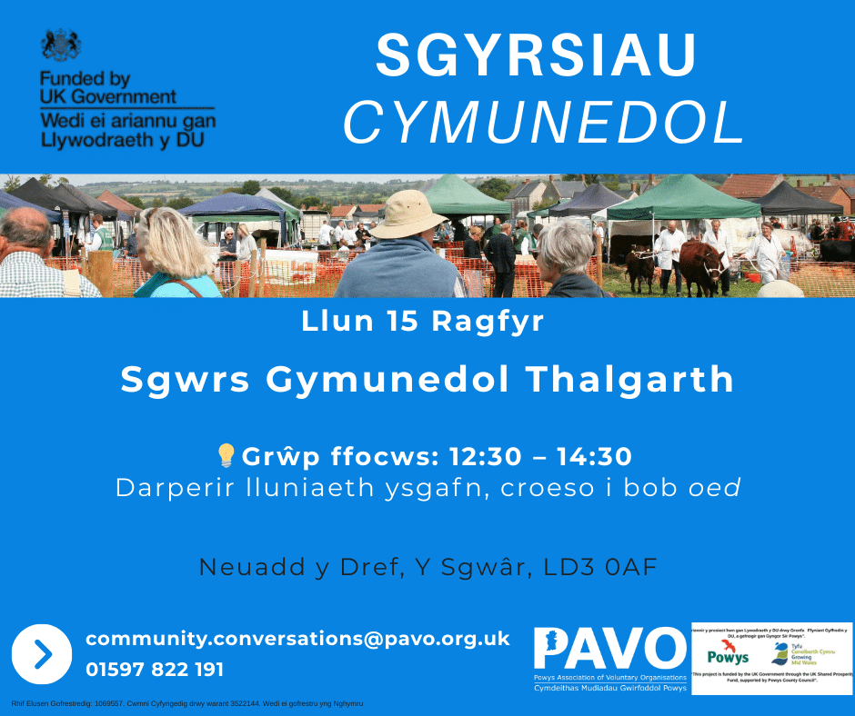 Fel rhan o raglen Cronfa Ffyniant a Rennir Llywodraeth y DU, rydym yn cynnal cyfres o Sgyrsiau Cymunedol ledled Powys. Rydym am glywed gan bobl leol a grwpiau cymunedol – i ddeall eich anghenion, eich blaenoriaethau a’ch dyheadau, ac i weithio gyda chi ar lunio atebion ar gyfer materion lleol sydd bwysicaf i’ch cymuned.