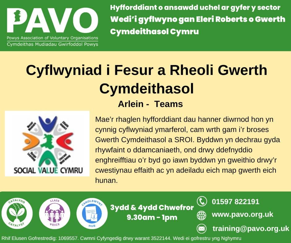 Mae’r rhaglen hyfforddiant dau hanner diwrnod hon yn cynnig cyflwyniad ymarferol, cam wrth gam i’r broses Gwerth Cymdeithasol a SROI. Byddwn yn dechrau gyda rhywfaint o ddamcaniaeth, ond drwy ddefnyddio