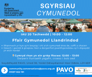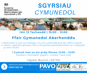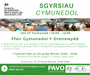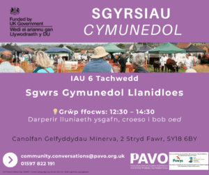 Ymunwch â ni am Sgwrs Gymunedol am “Beth sy’n Bwysig” i Llanidloes. Pryd a ble? IAU 6ed Tachwedd 12:30 - 14:30: Grŵp ffocws: Darperir lluniaeth ysgafn, croeso i bob oed Canolfan Gelfyddydau Minerva, 2 Stryd Fawr, SY18 6BY Archebwch eich lle yma: https://bit.ly/LlanidloesCommunityConversation Nid oes angen i chi archebu, ond os hoffech chi roi gwybod...