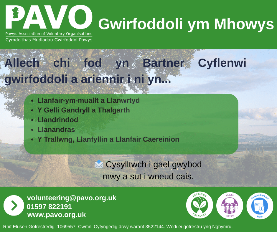 Gwirfoddoli PAVO ym Mhowys – Galw am Bartneriaid Cyflenwi Gwirfoddoli