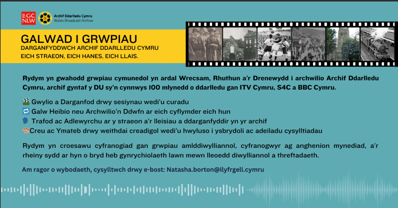 Galwad i Grwpiau Cymunedol yn Wrecsam, Rhuthun a’r Drenewydd! Darganfyddwch Archif Ddarlledu Cymru – Eich Straeon, Eich Hanes, Eich Llais.Rydym yn gwahodd grwpiau cymunedol yn ardal Wrecsam, Rhuthun a’r Drenewydd i archwilio Archif Ddarlledu Cymru – archif gyntaf y DU sy’n cynnwys 100 mlynedd o ddarlledu gan ITV Cymru, S4C a BBC Cymru.