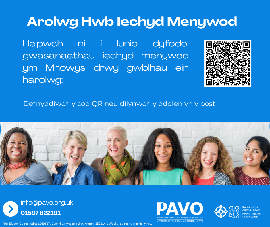 Mae PAVO yn gweithio ar ran Bwrdd Iechyd Addysgu Powys i ymgysylltu â thrigolion lleol, gan gasglu barn i helpu i ddatblygu Canolfan Iechyd Menywod newydd ar gyfer Powys. Bydd y Ganolfan yn arbenigo mewn tri phrif faes: mislif, atal cenhedlu a’r menopos. Hoffem i’ch barn helpu i siapio Canolfan, yr hyn y dylai ei gynnig mewn perthynas â’r tri maes a sut y caiff ei darparu.