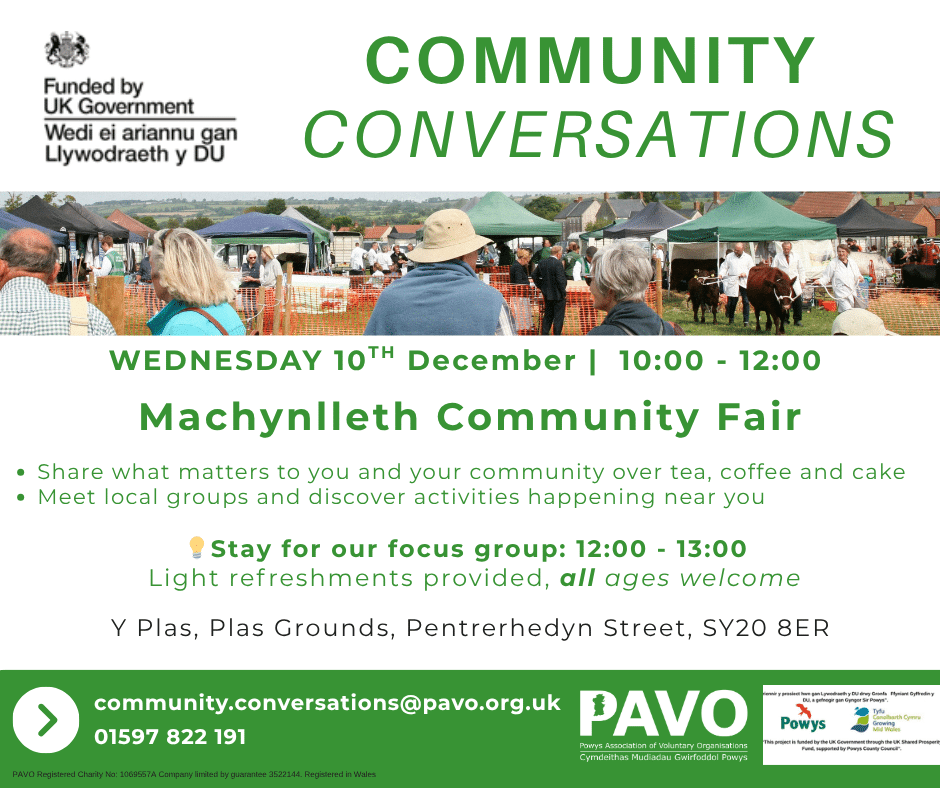 Join us for a Community Conversation about ‘What Matters’ to Montgomery. When and where? TUESDAY 2nd December 10:00 - 12:00: Community Fair: Meet local groups, find out what’s on and share what matters to you and your community over tea, coffee and cake 12:00 - 13:00: Focus group: Light refreshments provided, all ages welcome Montgomery...
