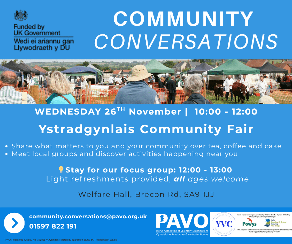 Join us for a Community Conversation about ‘What Matters’ to Ystradgynlais. When and where? WEDNESDAY 26th November 10:00 - 12:00: Community Fair: Meet local groups, find out what’s on and share what matters to you and your community over tea, coffee and cake 12:00 - 13:00: Focus group: Light refreshments provided, all ages welcome Welfare Hall,...