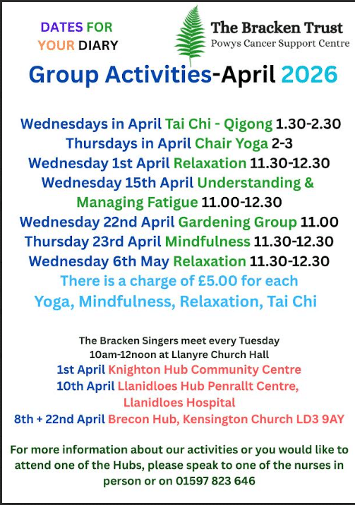 For more information about these activities or if you would like to attend one of the Hubs, please speak to one of the nurses on 01597 823 646