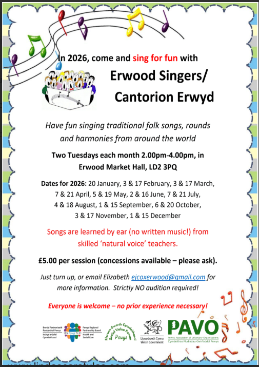 Have fun singing traditional folk songs, rounds and harmonies from around the world Two Tuesdays each month 2.00pm-4.00pm, in Erwood Market Hall, LD2 3PQ