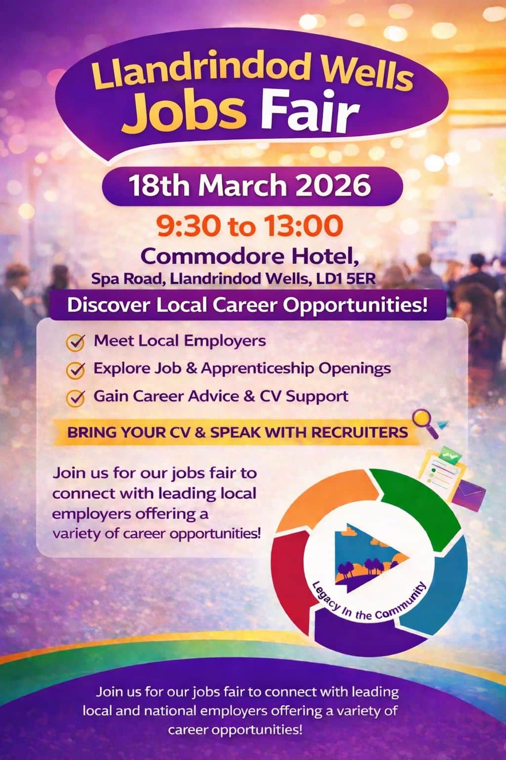 In partnership with the DWP, Legacy in the Community are pleased to be hosting the Llandrindod Wells Jobs Fair and would love for local employers and organisations to get involved.
