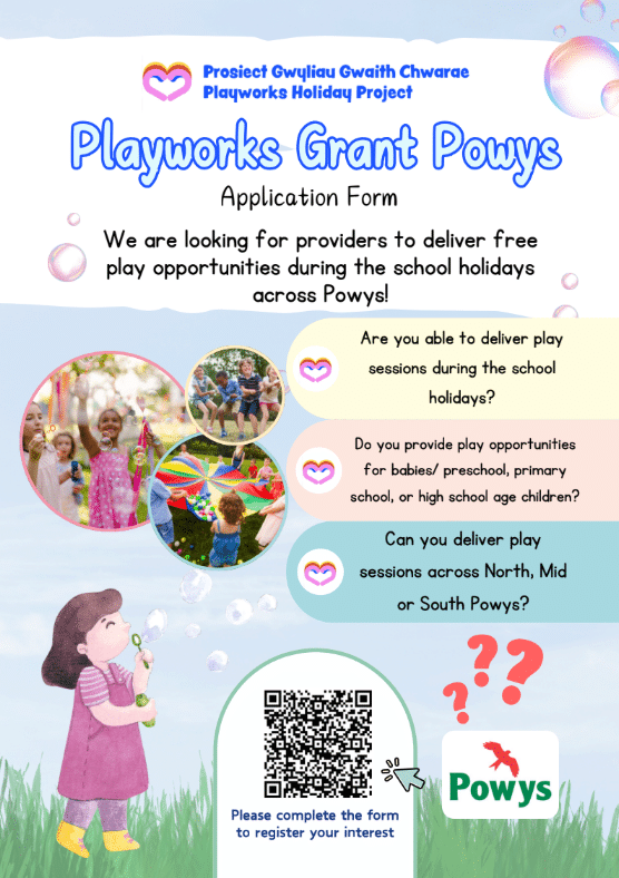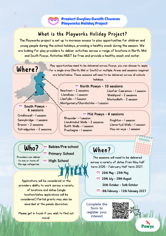 The Playworks project is set up to increase access to play opportunities for children and young people during the school holidays, providing a healthy snack during the session. We are looking for play providers to deliver activities across a range of locations in North, Mid and South Powys. Activities MUST be free and provide a healthy snack and water.
