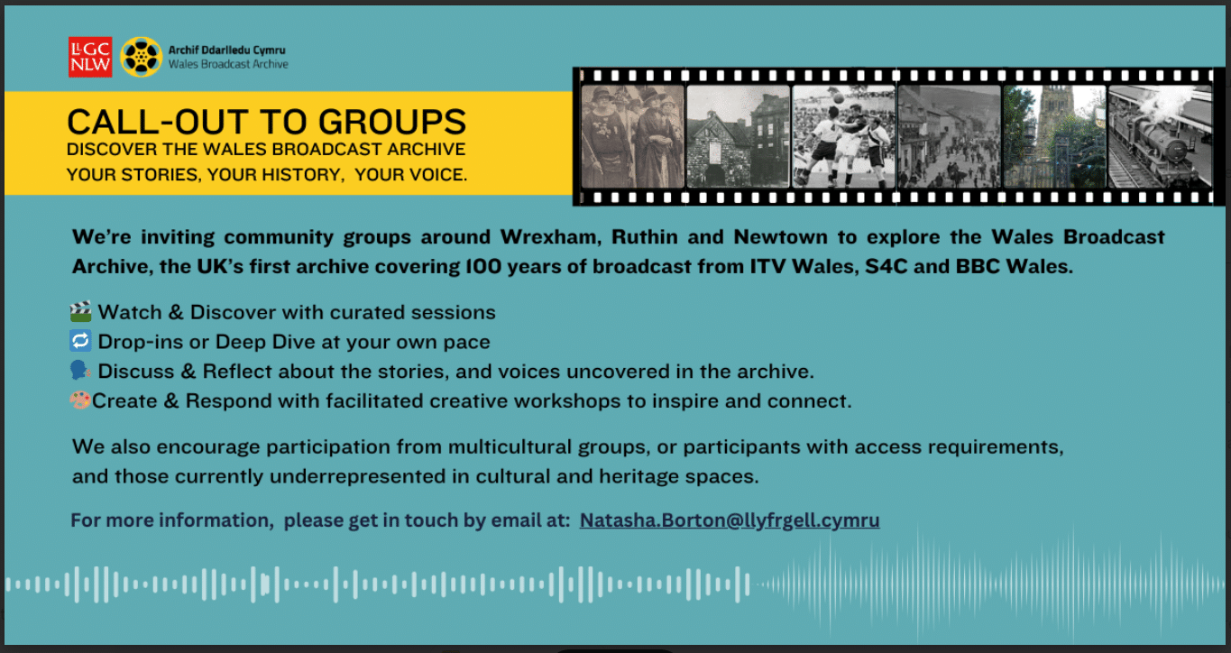 Inviting community groups around Wrexham, Ruthin and Newtown to explore the Wales Broadcast Archive, the UK’s first archive covering 100 years of broadcast from ITV Wales, S4C and BBC Wales.
